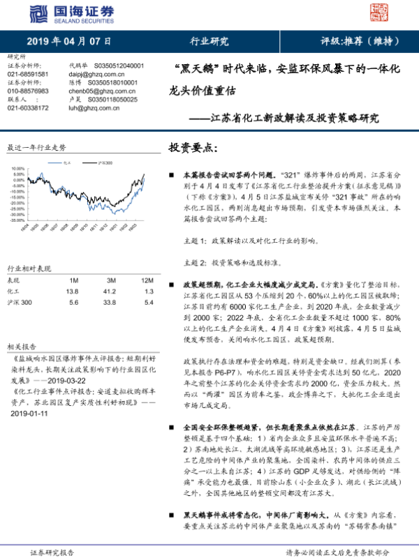 【国海证券】【20190407】江苏省化工新政解读及投资策略研究:“黑天鹅”时代来临,安监环保风暴下的一体化龙头价值重估-13页 行业研究