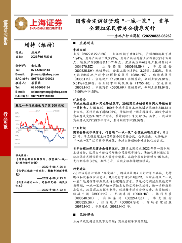 【上海证券】【20220829】房地产行业周报:国常会定调信贷端“一城一策”,首单全额担保民营房企债券发行-12页 行业研究