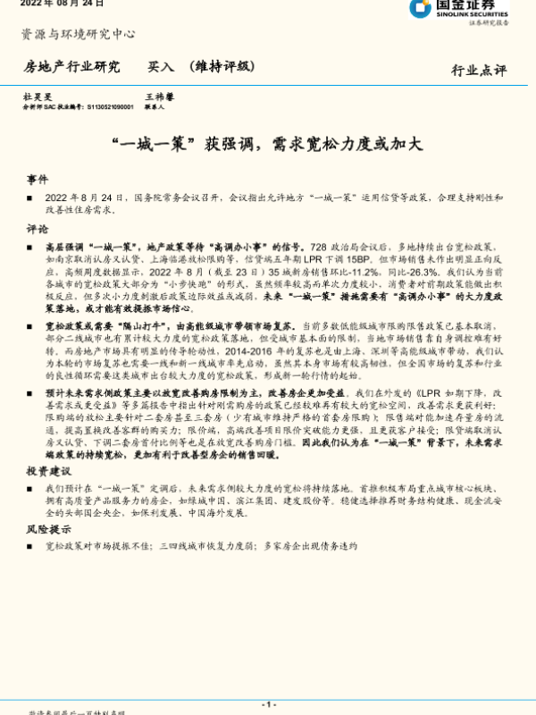 【国金证券】【20220824】“一城一策”获强调,需求宽松力度或加大-6页 行业研究