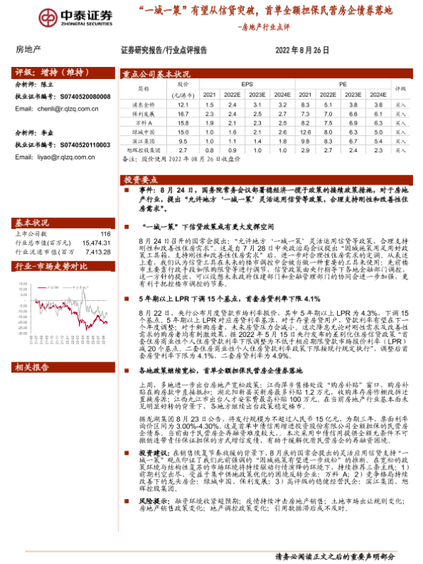 【中泰证券】【20220826】“一城一策”有望从信贷突破,首单全额担保民营房企债券落地-2页 行业研究