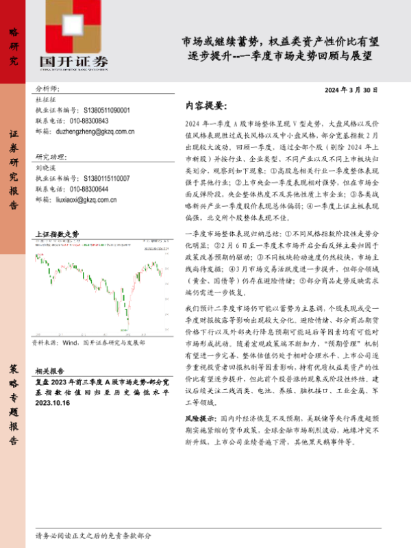 【国开证券】【20240330】一季度市场走势回顾与展望:市场或继续蓄势,权益类资产性价比有望逐步提升-17页 行业研究