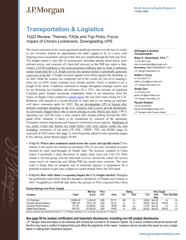 【J.P. Morgan】【20220513】J.P. 摩根-美股运输与物流行业-2022年第一季度回顾;聚焦中国封锁的影响,UPS降级-56页 行业研究