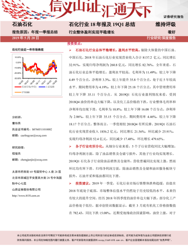 【山西证券】【20190520】石化行业18年报及19Q1总结:行业整体盈利实现平稳增长-29页 行业研究