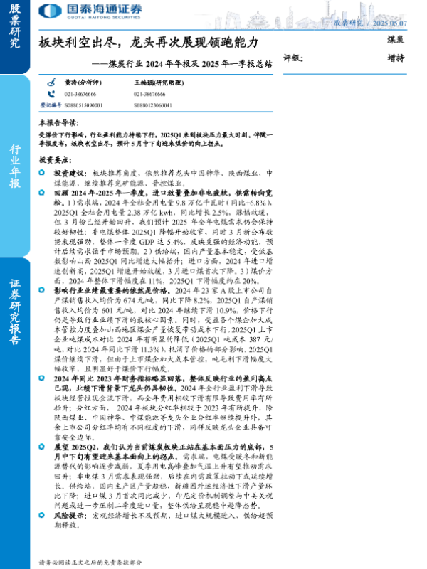 【国泰海通证券】【20250507】煤炭行业2024年年报及2025年一季报总结-21页 证券期货研究报告