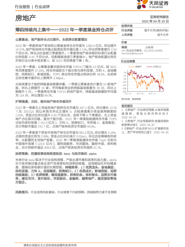 【天风证券】【20220425】房地产2022年一季度基金持仓点评:筹码持续向上集中-7页 行业研究
