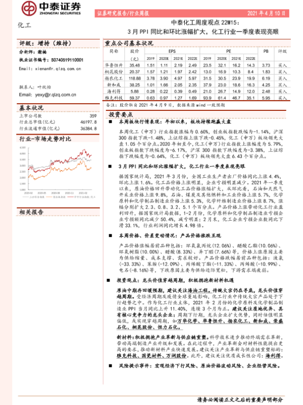 【中泰证券】【20210410】中泰化工周度观点22W15:3月PPI同比和环比涨幅扩大,化工行业一季度表现亮眼-26页 行业研究