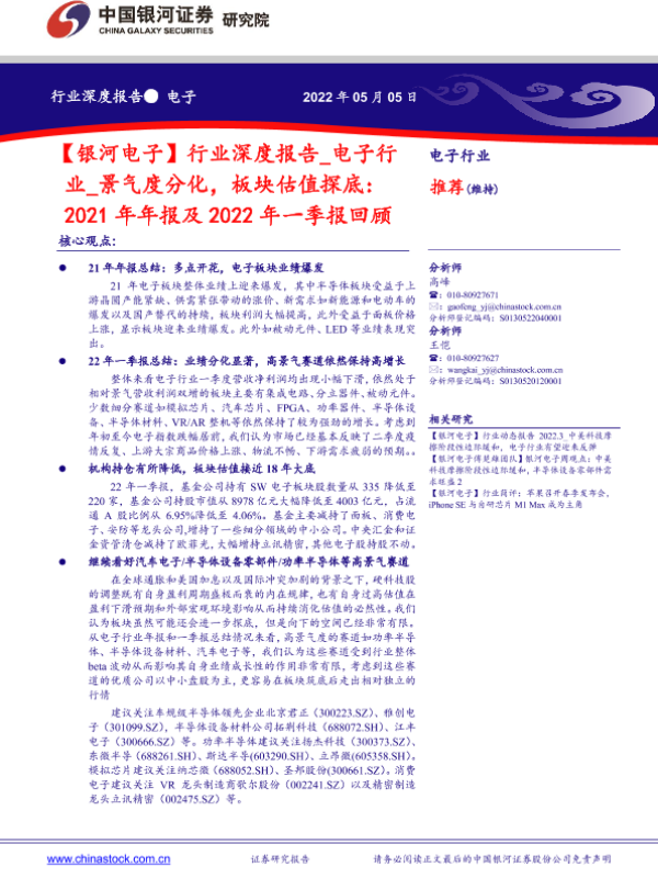 【银河证券】【20220505】电子行业深度报告:2021年年报及2022年一季报回顾,景气度分化,板块估值探底-34页 行业研究