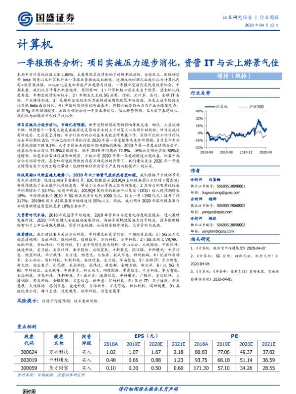 【国盛证券】【20200412】20200412-国盛证券-计算机行业周报:一季报预告分析:项目实施压力逐步消化,资管IT与云上游景气佳-17页 行业研究