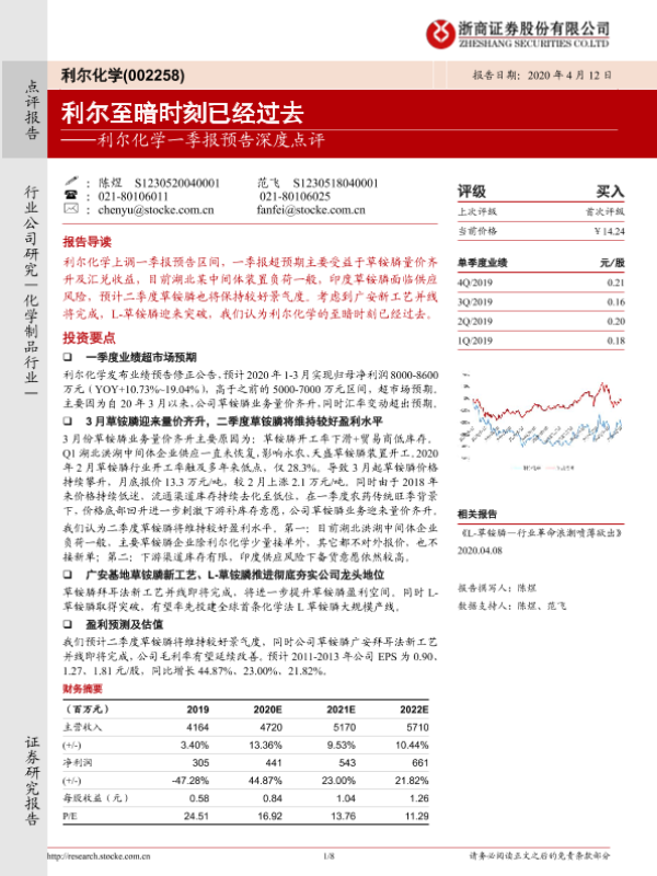 【浙商证券】【20200412】利尔化学一季报预告深度点评:利尔至暗时刻已经过去-8页 行业研究