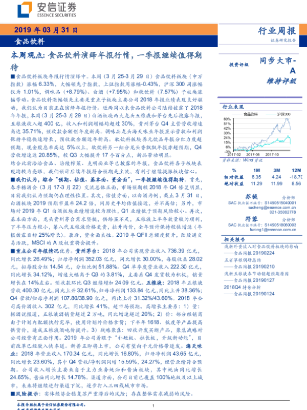 【安信证券】【20190331】20190331-安信证券-食品饮料本周观点:食品饮料演绎年报行情,一季报继续值得期待-26页 行业研究