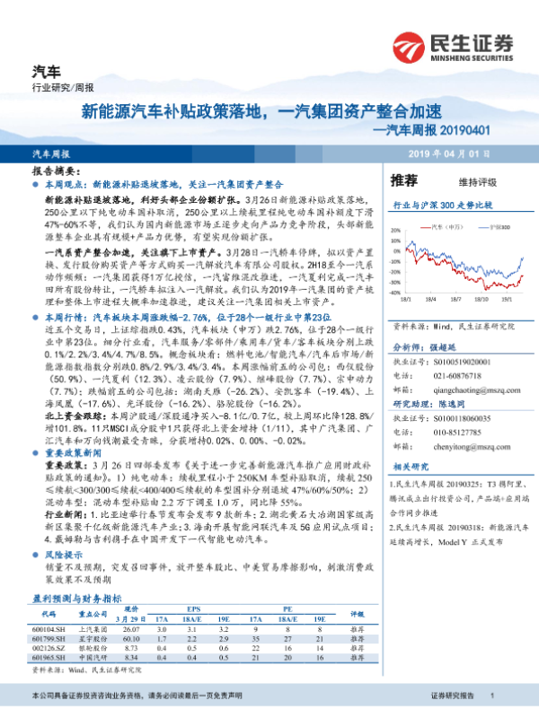 【民生证券】【20190401】20190401-民生证券-汽车周报:新能源汽车补贴政策落地,一汽集团资产整合加速-22页 行业研究