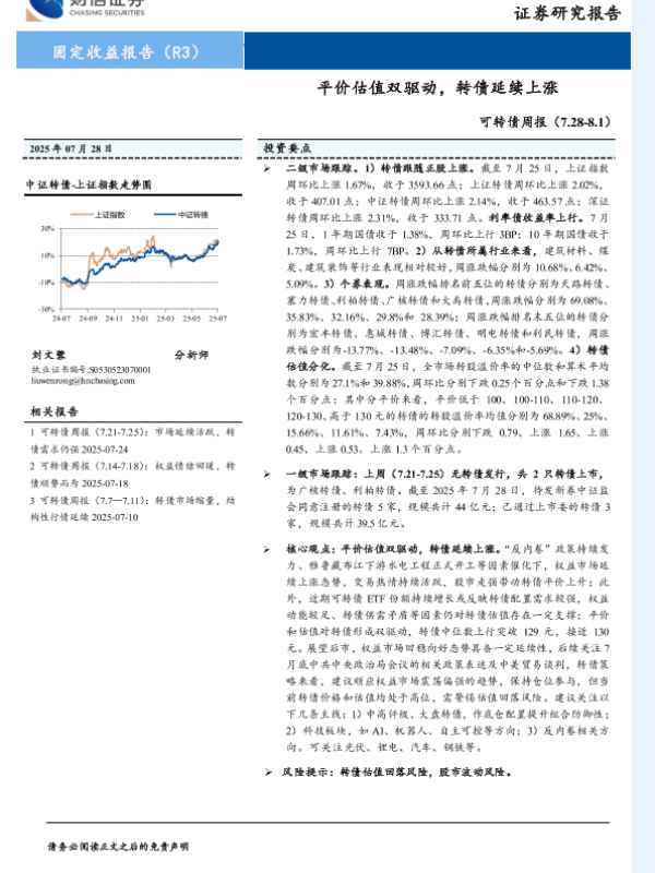 【财信证券】【20250728】可转债周报:平价估值双驱动,转债延续上涨-10页 证券期货研究报告