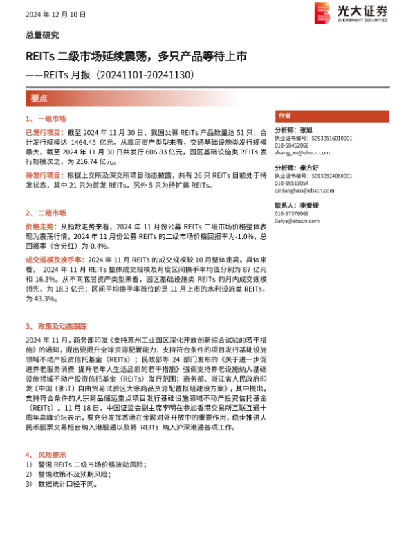 【光大证券】【20241210】REITs月报:REITs二级市场延续震荡,多只产品等待上市-13页 行业研究