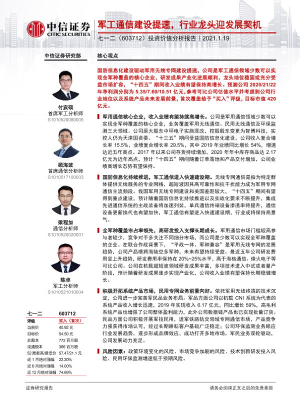 【中信证券】【20210119】20210119-中信证券-七一二-603712.SH-投资价值分析报告:军工通信建设提速,行业龙头迎发展契机-31页 行业研究