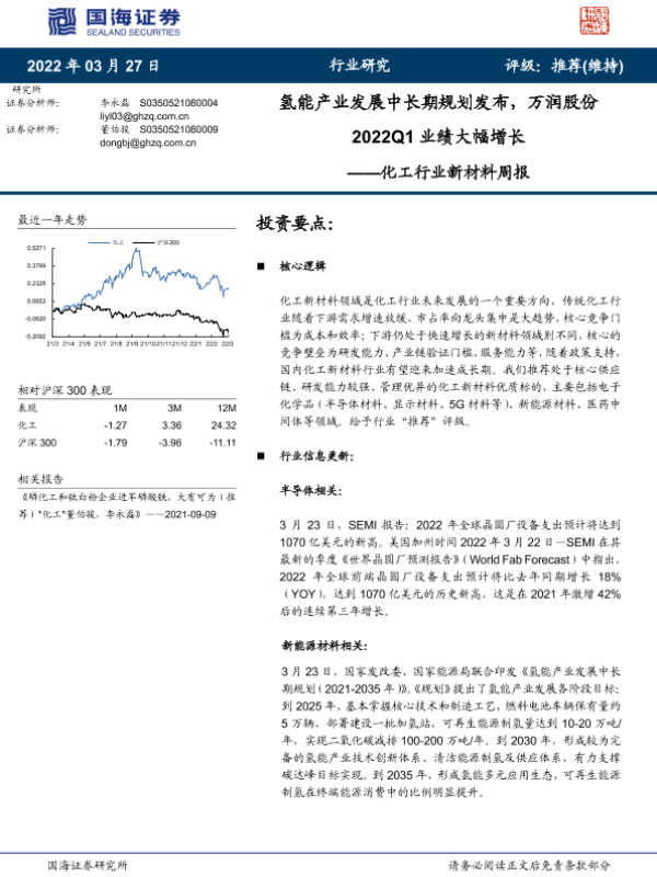 【国海证券】【20220327】20220327-国海证券-化工行业新材料周报:氢能产业发展中长期规划发布,万润股份2022Q1业绩大幅增长-40页 行业研究