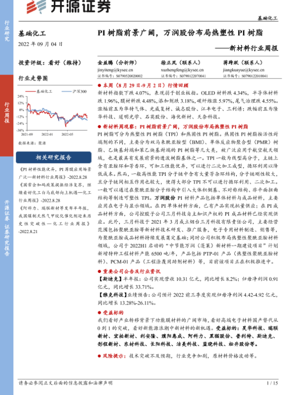 【开源证券】【20220904】PI树脂前景广阔,万润股份布局热塑性PI树脂-15页 行业研究