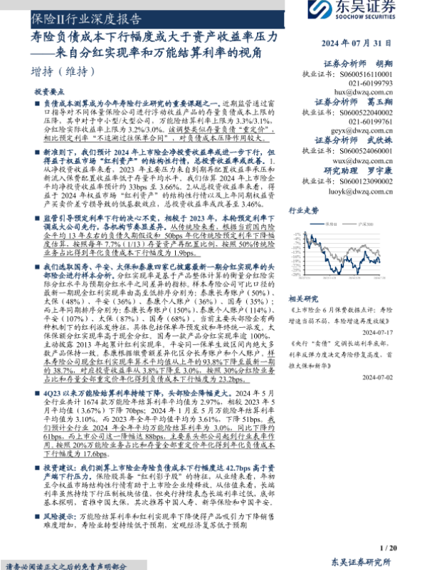 【东吴证券】【20240731】保险Ⅱ行业深度报告-来自分红实现率和万能结算利率的视角-寿险负债成本下行幅度或大于资产收益率压力-20页 行业研究