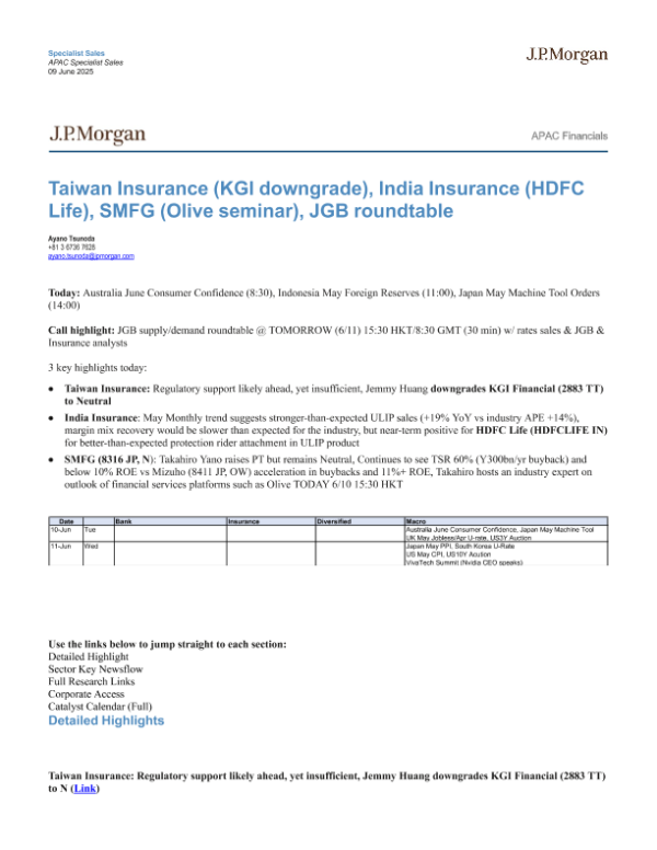 【J.P. Morgan】【20250609】Taiwan Insurance(KGI downgrade), India Insurance(HDFC Life), SMFG(Olive seminar), JGB roundtable-8页 行业研究