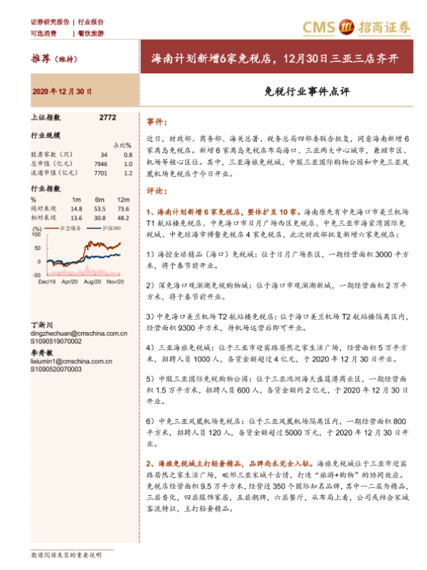 【海通证券】【20201230】免税行业事件点评:海南计划新增6家免税店,12月30日三亚三店齐开-4页 行业研究