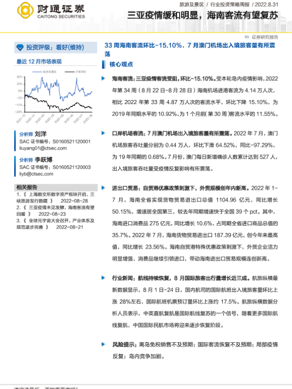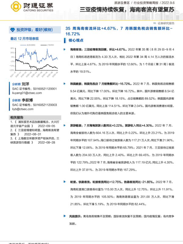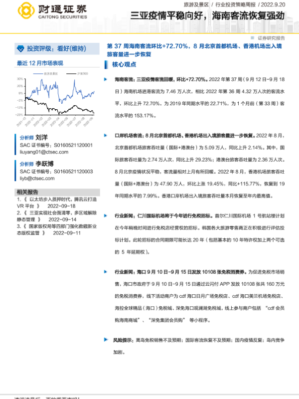 【财通证券】【20220920】旅游及景区行业投资策略周报:三亚疫情平稳向好,海南客流恢复强劲-12页 行业研究