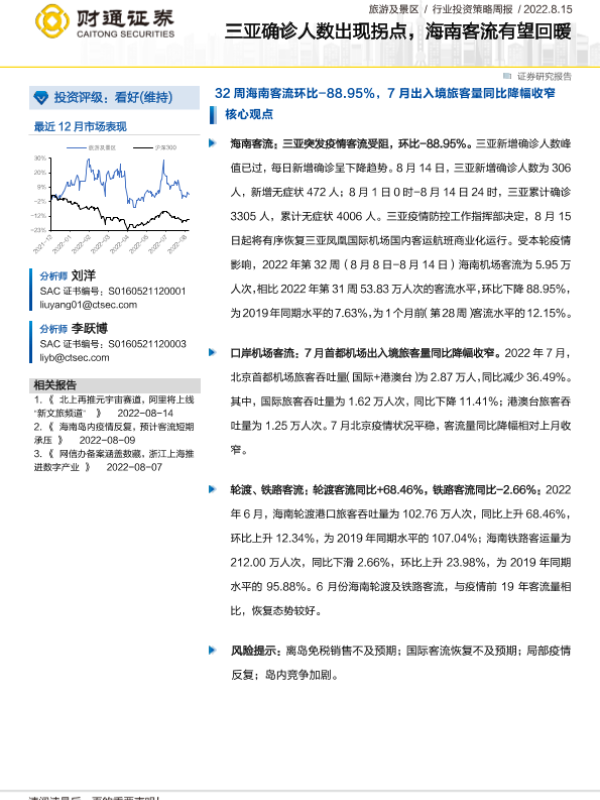 【财通证券】【20220815】旅游及景区行业投资策略周报:三亚确诊人数出现拐点,海南客流有望回暖-15页 行业研究
