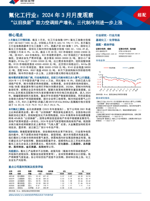 【国信证券】【20240329】氟化工行业2024年3月月度观察:“以旧换新”助力空调排产增长,三代制冷剂进一步上涨-29页 行业研究