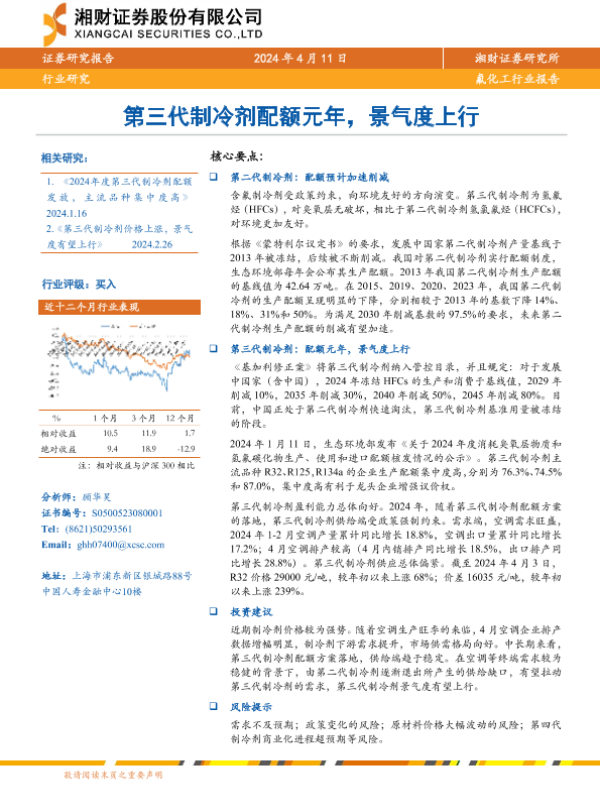 【湘财证券】【20240411】氟化工行业报告:第三代制冷剂配额元年,景气度上行-14页 行业研究