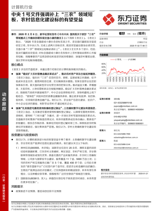 【东方证券】【20200206】中央1号文件强调补上“三农”领域短板,农村信息化建设标的有望受益-3页 证券期货研究报告