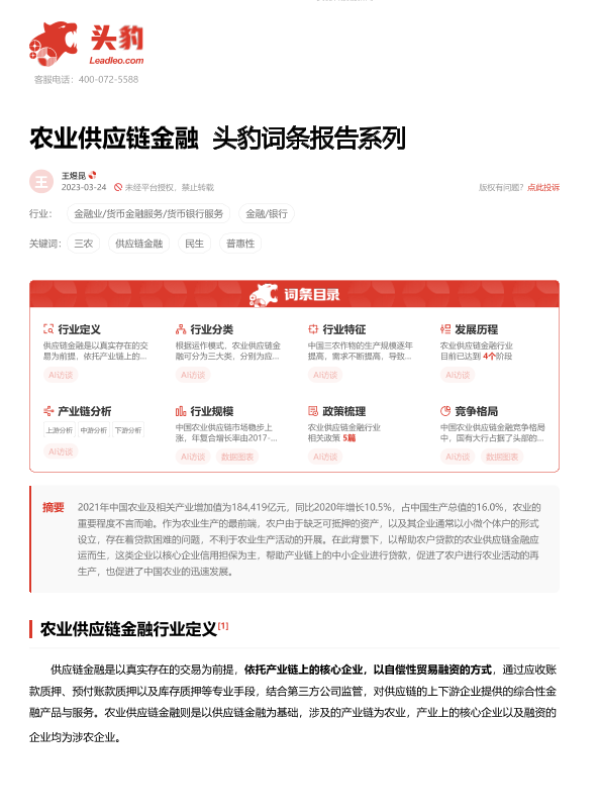 【头豹研究院】【20230713】农业供应链金融 头豹词条报告系列-17页 行业研究