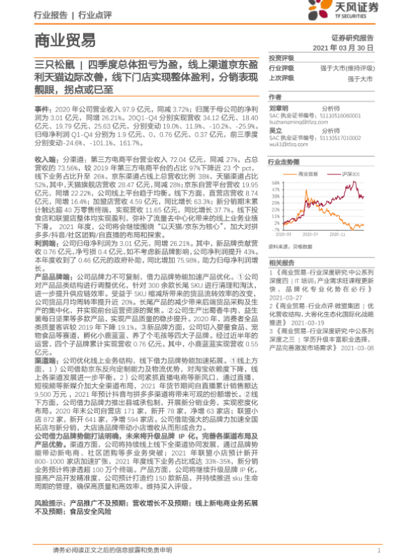 【天风证券】【20210330】三只松鼠四季度总体扭亏为盈,线上渠道京东盈利天猫边际改善,线下门店实现整体盈利,分销表靓眼,拐点或已至-6页 行业研究