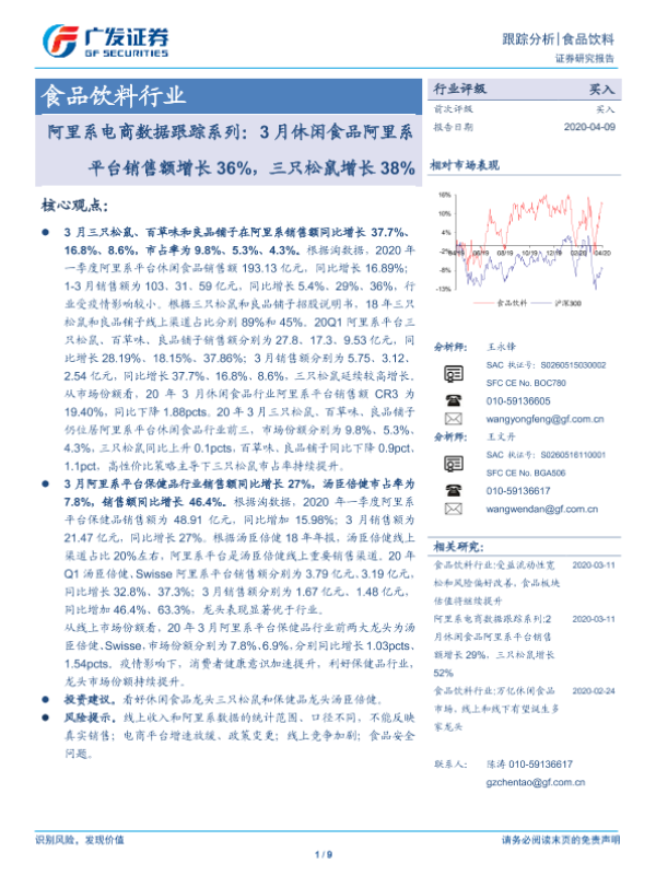 【广发证券】【20200409】食品饮料行业:阿里系电商数据跟踪系列:3月休闲食品阿里系平台销售额增长36%,三只松鼠增长38%-9页 行业研究