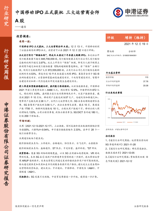 【申港证券】【20211219】通信:中国移动IPO正式获批 三大运营商会师A股-10页 行业研究