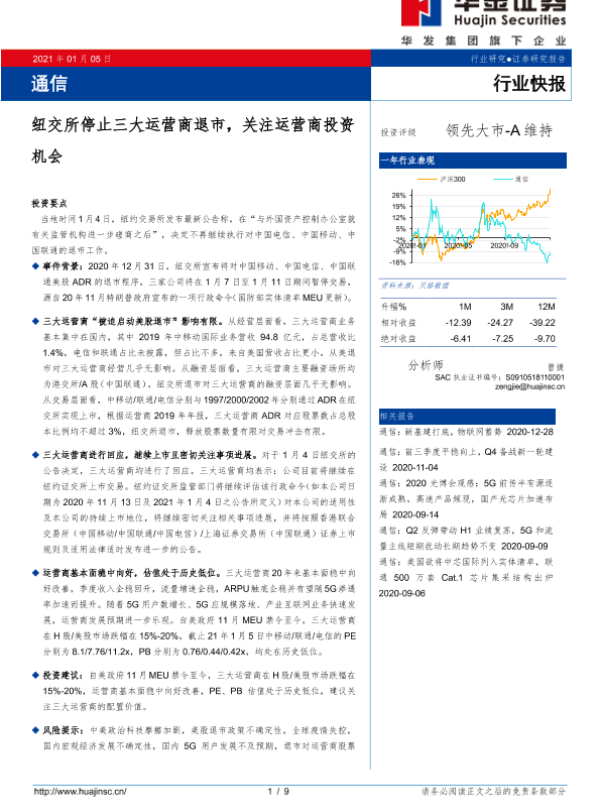 【华金证券】【20210105】通信行业:纽交所停止三大运营商退市,关注运营商投资机会-9页 行业研究