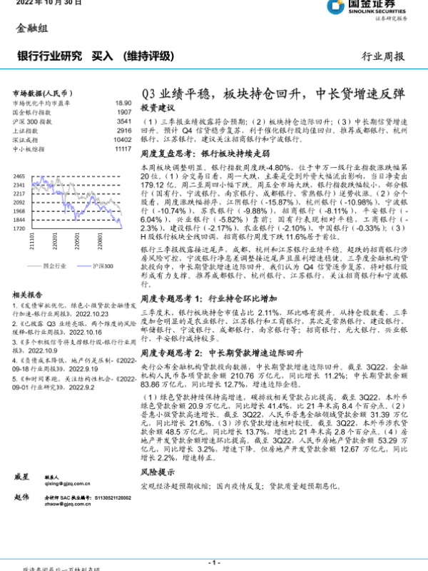 【国金证券】【20221030】Q3业绩平稳,板块持仓回升,中长贷增速反弹-10页 行业研究