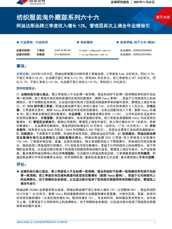【国信证券】【202511】纺织服装海外跟踪系列六十六:阿迪达斯品牌三季度收入增长12%,管理层再次上调全年业绩指引-11页 证券期货研究报告