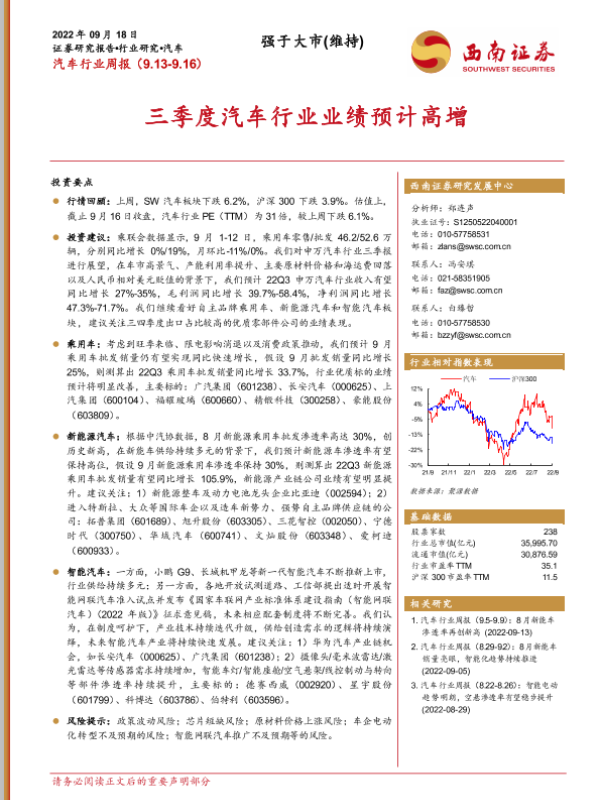【西南证券】【20220918】20220918-西南证券-汽车行业周报:三季度汽车行业业绩预计高增-19页 行业研究