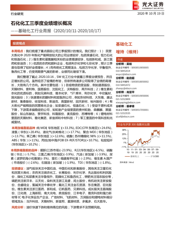 【光大证券】【20201019】基础化工行业周报:石化化工三季度业绩增长概况-25页 行业研究