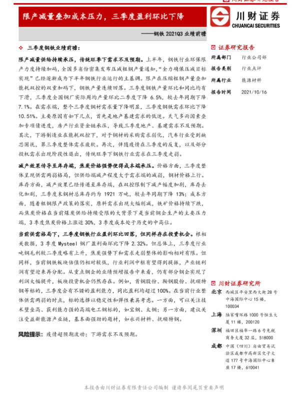 【川财证券】【20211016】钢铁2021Q3业绩前瞻:限产减量叠加成本压力,三季度盈利环比下降-5页 证券期货研究报告