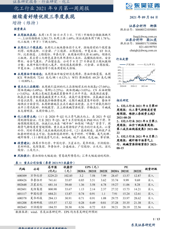 【东吴证券】【20210904】化工行业2021年9月第一周周报:继续看好绩优股三季度表现-13页 行业研究