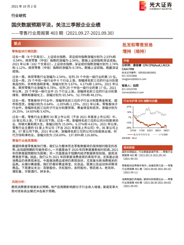 【光大证券】【20211002】20211002-光大证券-零售行业周报第403期:国庆数据预期平淡,关注三季报企业业绩-8页 行业研究