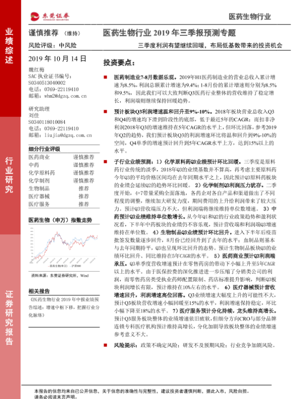 【东莞证券】【20191014】医药生物行业2019年三季报预测专题:三季度利润有望继续回暖,布局低基数带来的投资机会-16页 行业研究