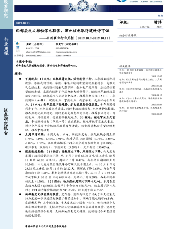 【国泰君安证券】【20191013】两部委发文推动煤电联营,漳州核电取得建造许可证-12页 行业研究