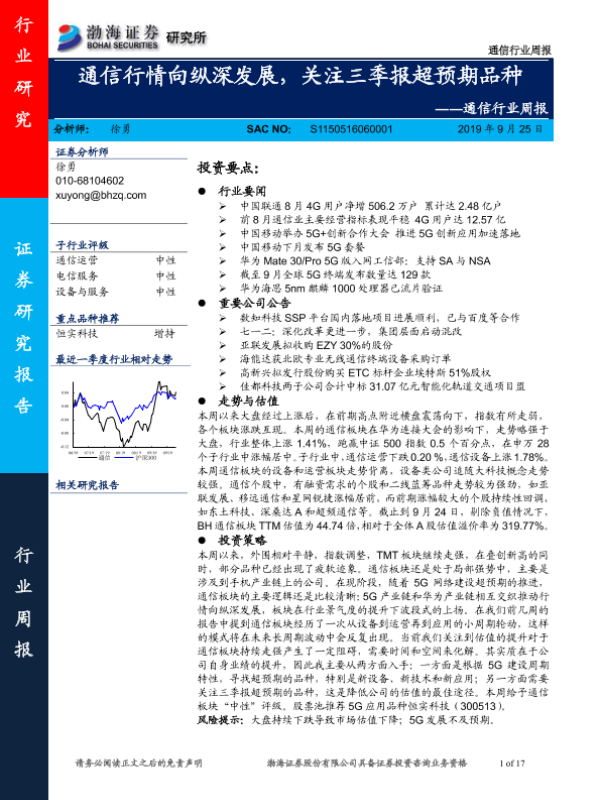 【渤海证券】【20190925】通信行业周报:通信行情向纵深发展,关注三季报超预期品种-17页 行业研究