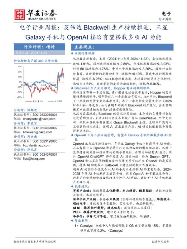 【华安证券】【20241124】20241124-华安证券-电子行业周报:英伟达Blackwell生产持续推进,三星Galaxy手机与OpenAI接洽有望搭载多项AI功能-24页 行业研究