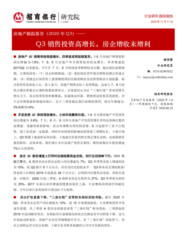 【招商银行】【20201111】房地产跟踪报告(2020年Q3):Q3销售投资高增长,房企增收未增利-21页 行业研究