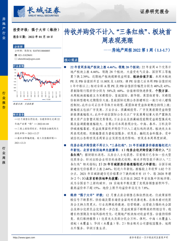 【长城证券】【20220110】房地产周报2022第1周:传收并购贷不计入“三条红线”、板块首周表现亮眼-13页 行业研究