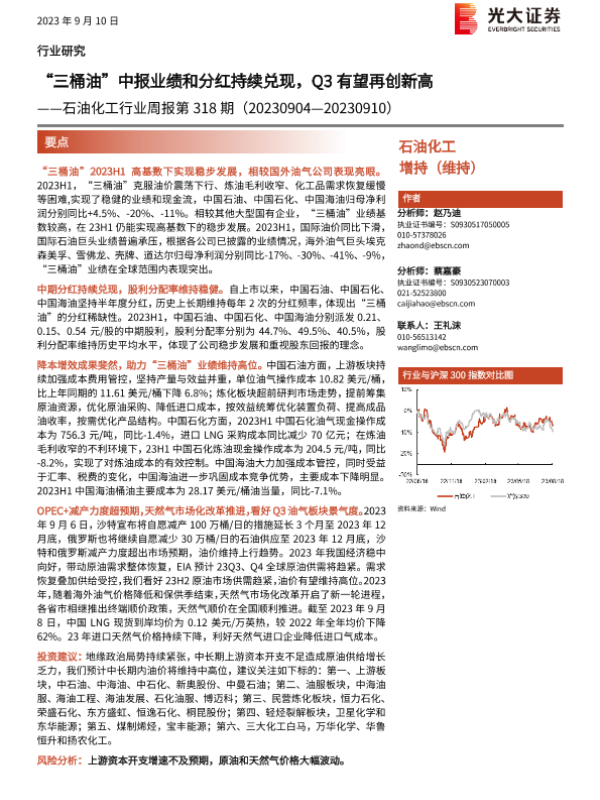【光大证券】【20230910】20230910-光大证券-石油化工行业周报第318期:“三桶油”中报业绩和分红持续兑现,Q3有望再创新高-26页 行业研究