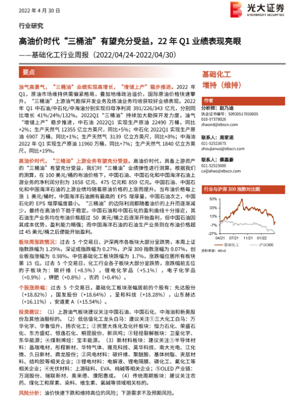 【光大证券】【20220430】20220430-光大证券-基础化工行业周报:高油价时代“三桶油”有望充分受益,22年Q1业绩表现亮眼-27页 行业研究