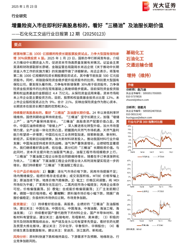 【光大证券】【20250123】石化化工交运行业日报第12期:增量险资入市在即利好高股息标的,看好“三桶油”及油服长期价值-11页 行业研究