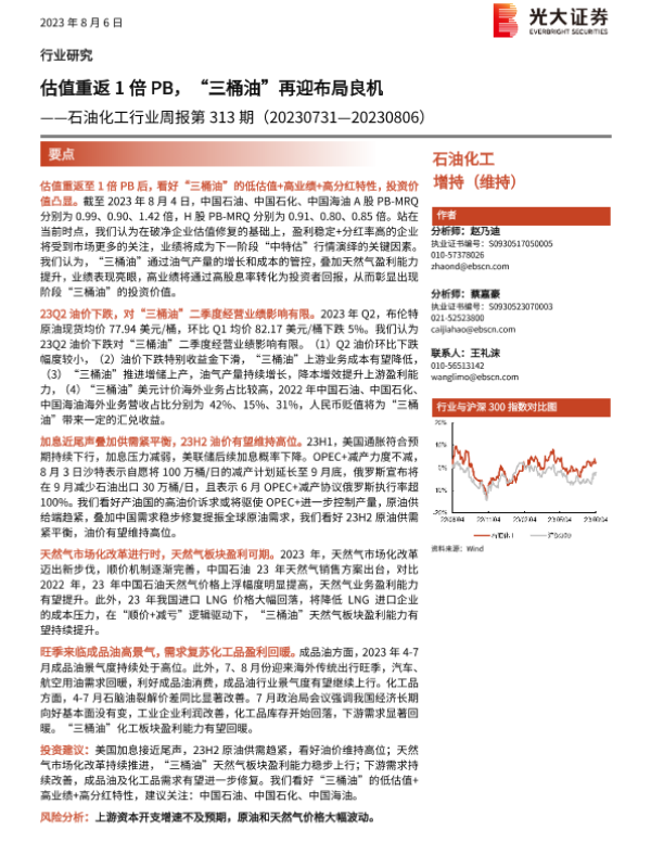 【光大证券】【20230806】20230806-光大证券-石油化工行业周报第313期:估值重返1倍PB,“三桶油”再迎布局良机-28页 行业研究
